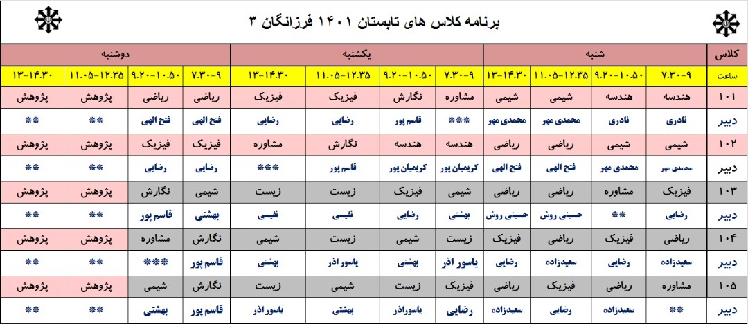 دوره تابستان از روز شنبه 22 مرداد ماه از ساعت 7:30 الی 14:30 برگزار می گردد.